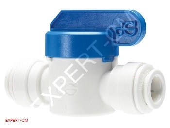 )Кран полнопроходной. Цанги с диаметром 6 мм. Белый полипропилен с уплотнением EPDM.